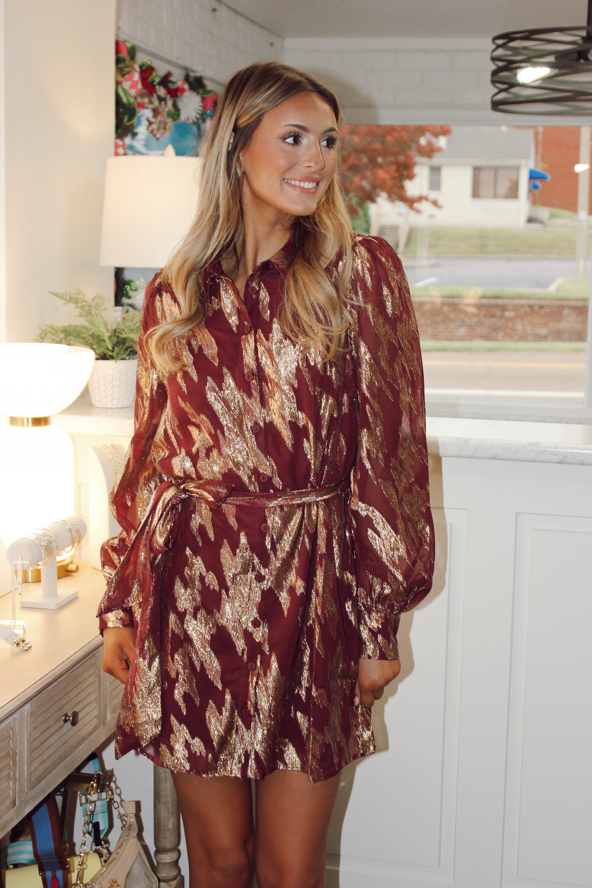 A metallic threaded woven mini dress featuring collar, bow tie, front button down and long sleeve with cuff Details: Self : 100% Polyester Lining : 100% Polyester